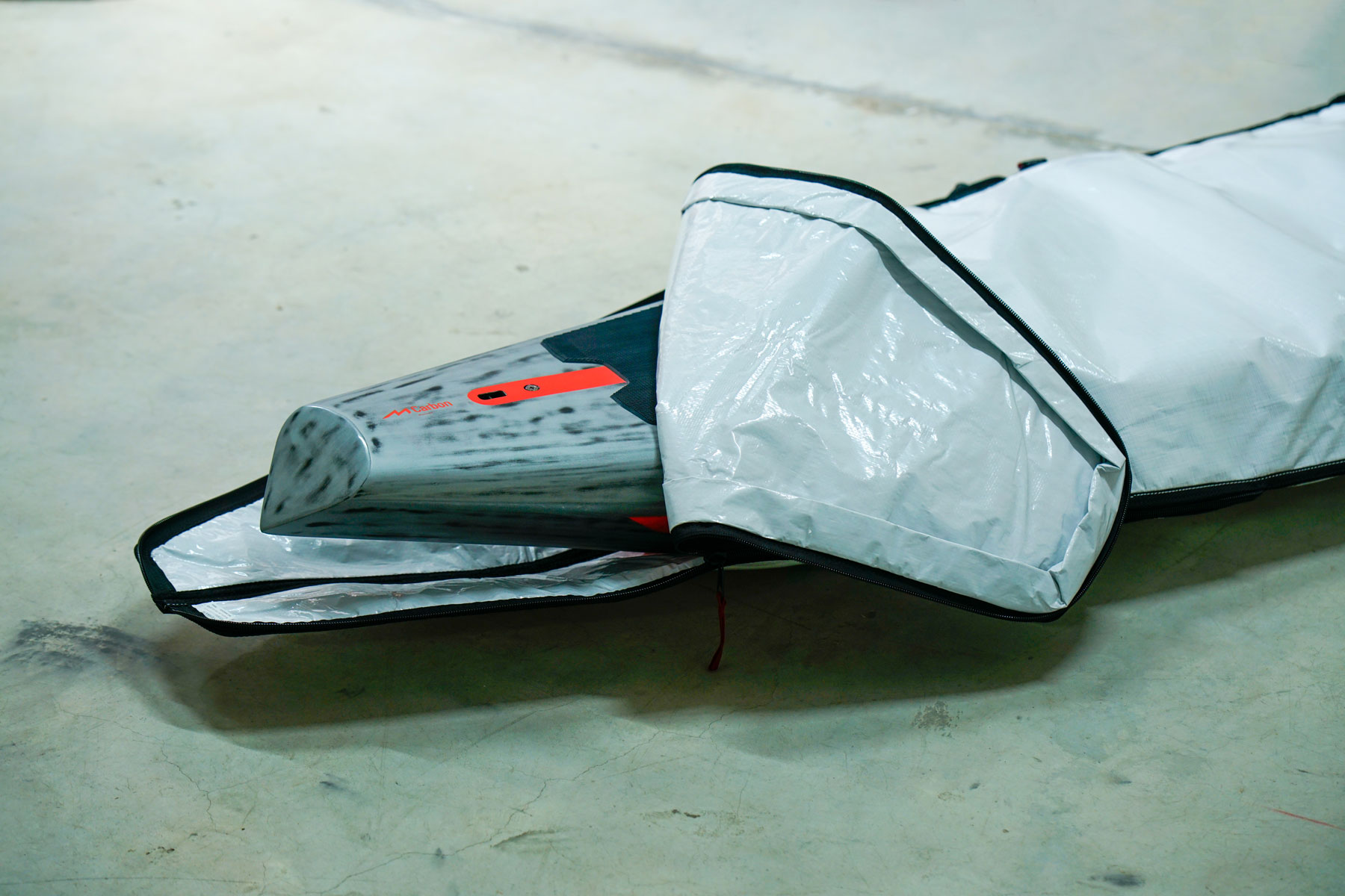DOWNWIND FOIL SINGLE BOARD BAG. Designed to protect downwind foil boards in between sessions. This simple bag allows you to keep your foil attached to your board at all times and it is ideal for easy protection without having to break down your foil setup each time. The 4mm padding and the reflective white tape will keep your board protected from the sun, scratches, and from the wear and tear of everyday life.